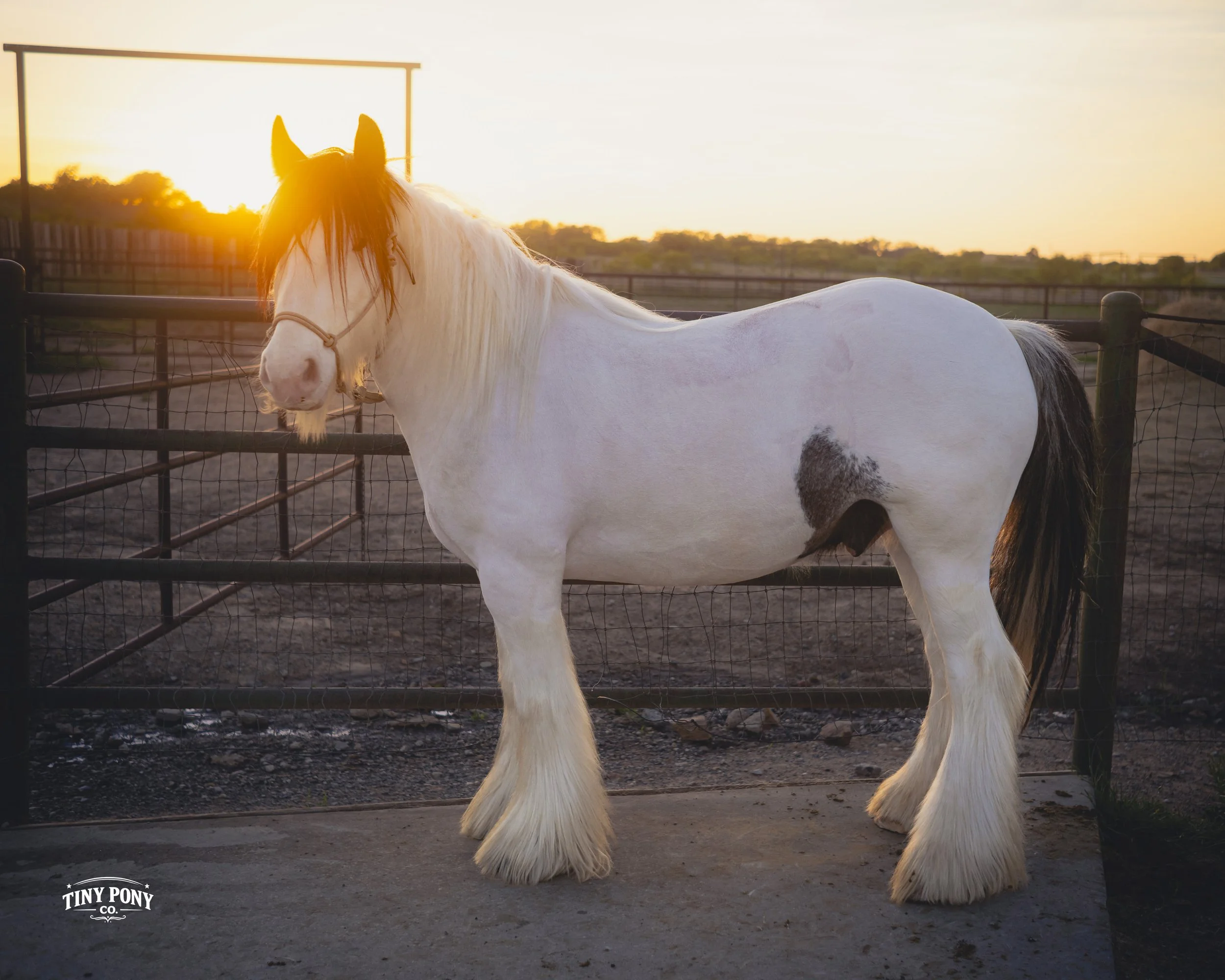 Tiny Pony Co. proudly offers Snowslip. This gelding is a sophisticated tricolor Gypsy Vanner gelding with blagdon on his neck and belly and a rare magic hat and black tail. He is 5 years old and stands a stout 14.1h. He is easy eyes and the farrier. Snowslip is an easy keeper that requires no maintenance and is currently on a forage only diet. He sells sound and UTD on vaccines. PPE welcome at buyer’s expense. Located in Jacksboro, TX.